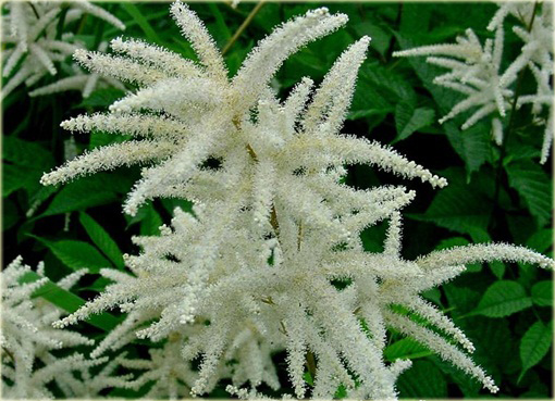 Roślina kwitnie w VI–VII, tworząc bardzo dekoracyjne wiechy. Kwiaty są drobne, białe lub kremowobiałe, zebrane w rozgałęzione, długie, nawet do 50 cm kwiatostany.