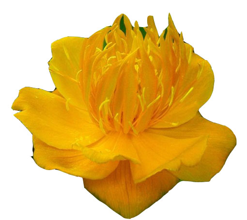 Jego kwiaty są pomarańczowożółte, otwarte, o stojących wewnętrznych płatkach przekształconych w miodniki. Ta odmiana jest najpóźniej kwitnącym pełnikiem bo pełnia kwitnienia przypada na lipiec.