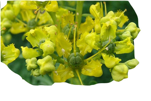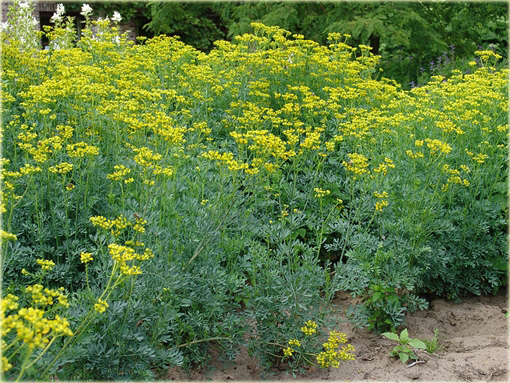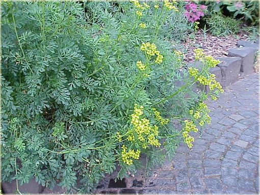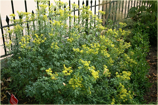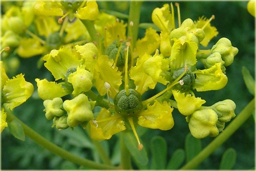 Ruta zwyczajna Ruta graveolens z rodziny Rutaceae jest wieloletnią byliną o wzniesionych pędach i połyskujących, wąskich liściach.