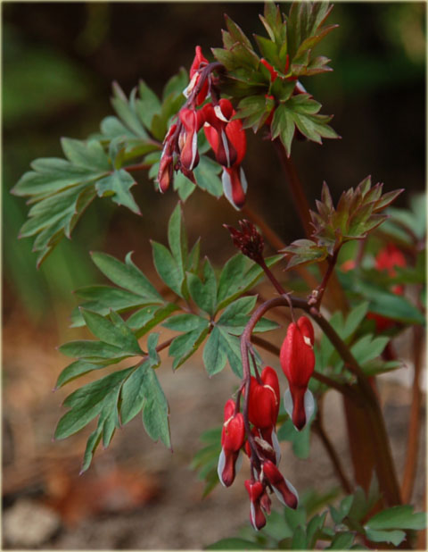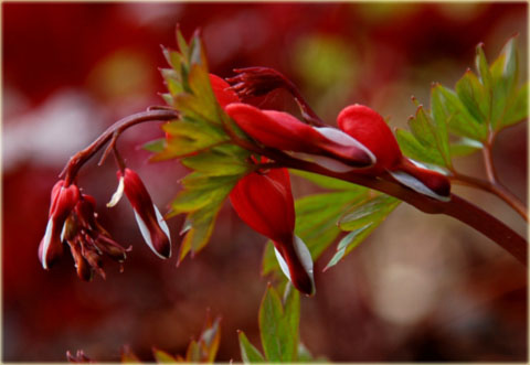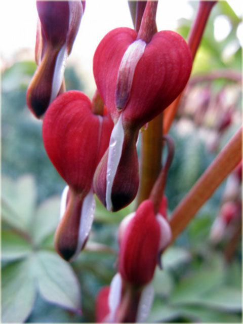 Serduszka okazała Valentine czerwona. Piękna i niezwykle interesująca odmiana, tworząca kępy, o czerwonych kwiatach, zebranych w długie grona. Roślina ceniona jest ze względu na ich niezwykły kształt przypominający łzawiące serce.