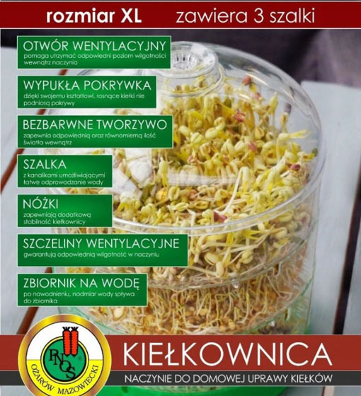 Naczynie do kiełkowania służy do wytwarzania kiełków we własnym domu. Kiełkownica PNOS została wykonana z wysokiej jakości tworzywa, które zapewnia jej wysoką trwałość i stabilność. Naczynie do kiełkowania jest przezroczyste, co zapewnia równomierne dopuszczenie światła do wszystkich nasion, a światło jest niezbędne do prawidłowego kiełkowania. Trzy szalki naczynia zostały wyposażone w specjalne wgłębienia a także mikrootworki, dzięki czemu odprowadzany jest nadmiar wody i zachowana odpowiednia wilgotność w naczyniu.