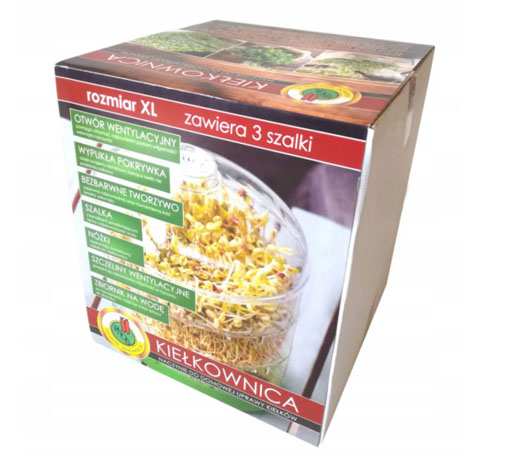 - 3 szalki- pozwalają one wytwarzać trzy różne gatunki nasion kiełków lub wysiewać kiełki w różnych okresach czasowych, tak aby zawsze mieć dostęp do świeżych kiełków