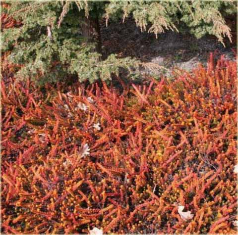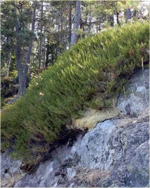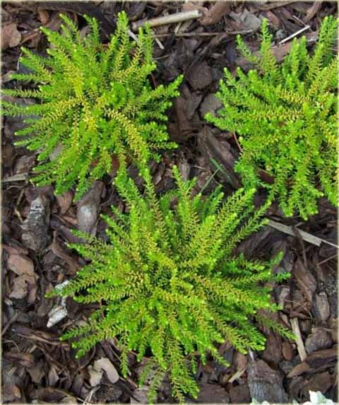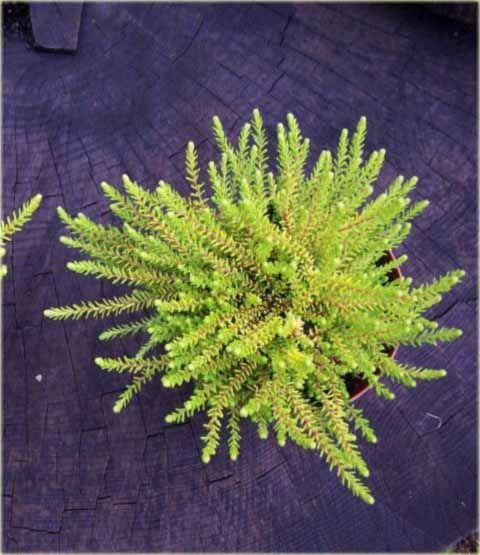 Jest wieloletnią, zimozieloną płożącą krzewinką, całkowicie mrozoodporną, pokrojem przypominająca wrzos. Jej gałązki, a także liście są gruczołowato owłosione, ciemnozielone, igiełkowe, równowąskie, spodem prawie zrośnięte, z białym kantem. Wyrastają w gęstych okółkach po 3-4. Są one w kolorze cytrynowożółtym, jesienią wybarwiają się w ognistych barwach pomarańczy.