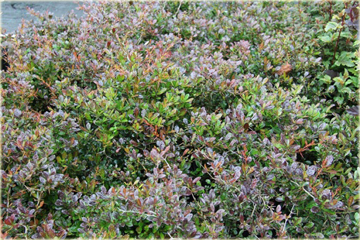 Liście ułożone na pędach skrętolegle. Są one purpurowoczerwone skórzaste i sztywne.