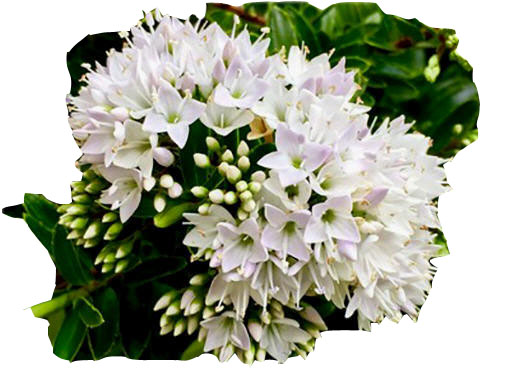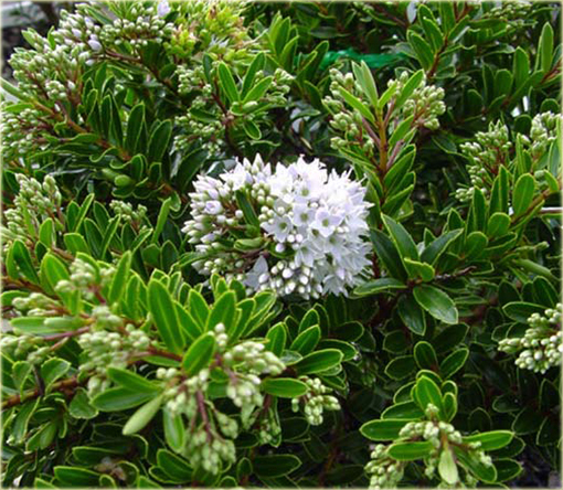 Hebe bukszpanowata Hebe buxifolia to wspaniała roślina ozdobna posiadająca wzniesione, sztywne pędy o gęsto osadzonych, zimozielonych liściach. Listki te są twarde, lśniące, jajowate, ostro zakończone, bez względu na porę roku, nawet zimą, nie opadają.