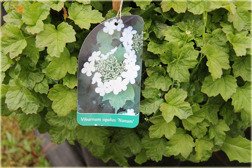 Viburnum opulus Nanum, to odmiana kaliny dorastająca do 50cm. Jest to gęsty, karłowy krzew o regularnym, płaskokulistym pokroju. Jego ozdobą są głównie liście soczyście zielone, bardzo gęsto ułożone na krótkich pędach, jesienią szkarłatne. Kalina koralowa Nanum wytwarza białe kwiaty, zebrane w płaskie kwiatostany, które rozwijają się niezbyt licznie w czerwcu. Viburnum opulus Nanum to roślina bardzo dekoracyjna. Polecana do małych ogrodów, na niskie żywopłoty i w większych grupach jako roślina okrywowa.