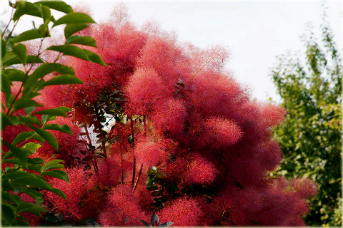 Cotinus coggygria red, czyli perukowiec podolski czerwony to niezwykły krzew ozdobny, który swoim nietuzinkowym wyglądem zawróci w głowie niejednemu kolekcjonerowi nietypowych roślin. Najbardziej zaskakującym elementem rośliny są bez wątpienia fantastycznie opierzone, pięknie czerwone owocostany pojawiające się po przekwitaniu drobnych, żółtych kwiatków. Puszyste obłoczki uczepione liści fantastycznie odbijają promienie słoneczne rozświetlając ogród wielobarwnymi refleksami iskrzącymi z daleka.