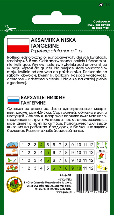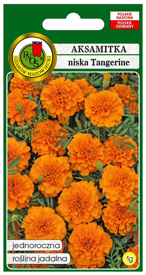 Aksamitka pełna niska Tangerine pomarańczowa to roślina jednoroczna, doskonała na rabaty, obwódki, kwietniki, balkony. Odmiana wczesna, obficie i równomiernie kwitnąca o pełnych, dwubarwnych dużych kwiatach, średnicy 4,5-5 cm. Wysiew nasion w kwietniu pod osłonami lub w maju wprost do gruntu. Na miejsce stałe wysadzać w końcu maja.