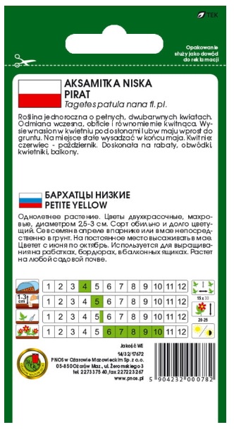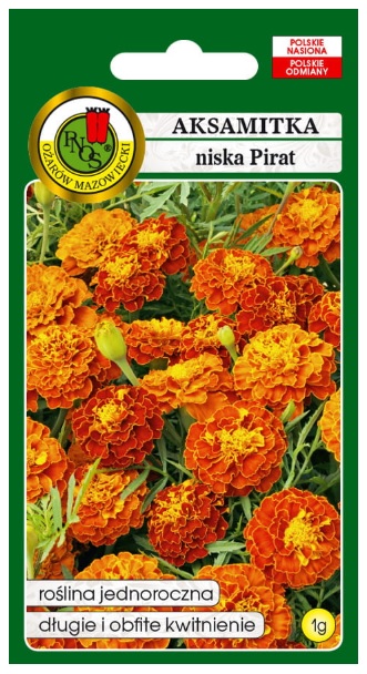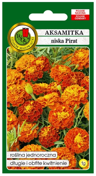 Aksamitka pełna niska Pirat miodowo-mahoniowa to roślina jednoroczna, doskonała na rabaty, obwódki, kwietniki, balkony. Odmiana wczesna, obficie i równomiernie kwitnąca o pełnych, dwubarwnych kwiatach, średnicy 4,5-5cm. Wysiew nasion w kwietniu pod osłonami lub w maju wprost do gruntu. Na miejsce stałe wysadzać w końcu maja.