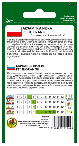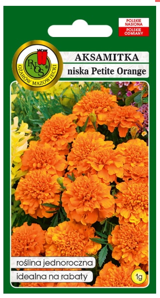 Aksamitka pełna Petite orange jest rośliną jednoroczną o pełnych kwiatach koloru pomarańczowego średnicy około 2,5-3 cm. Osiąga wysokość do 25 cm. Bardzo obficie i równomiernie kwitnie od lipca do pierwszych przymrozków. Polecana na rabaty, obwódki, do skrzynek, doniczek i na balkony. Odstrasza nicienie i mszyce. Udaje się na każdej glebie ogrodowej, ważne, aby była żyzna.