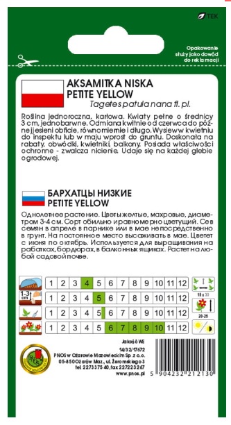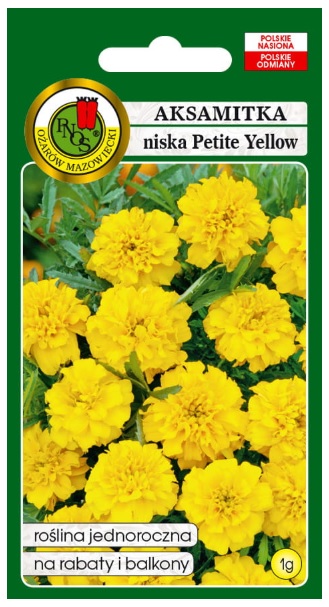 Aksamitka pełna Petite żółta jest rośliną jednoroczną o pełnych kwiatach koloru żółtego średnicy około 2,5-3 cm. Osiąga wysokość do 25 cm. Bardzo obficie i równomiernie kwitnie od lipca do pierwszych przymrozków. Polecana na rabaty, obwódki, do skrzynek, doniczek i na balkony. Odstrasza nicienie i mszyce. Udaje się na każdej glebie ogrodowej, ważne, aby była żyzna.