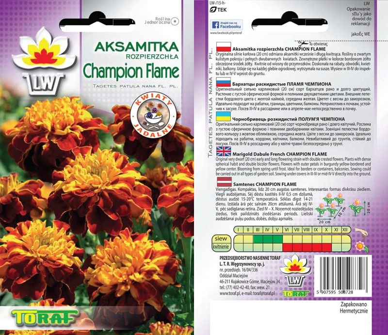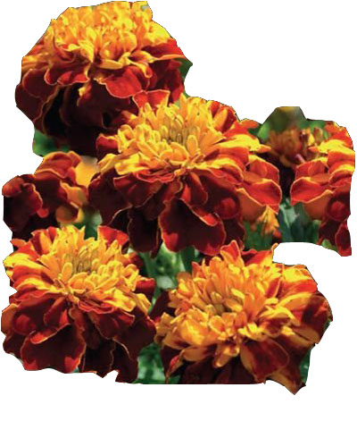 Oryginalna silnie karłowa (20cm) odmiana aksamitki wcześnie i długą kwitnąca. Rośliny o zwartym kulistym pokroju i pełnych dwubarwnych kwiatach. Zewnętrzne płatki w kolorze bordowym żółto obrzeżone środek żółty.