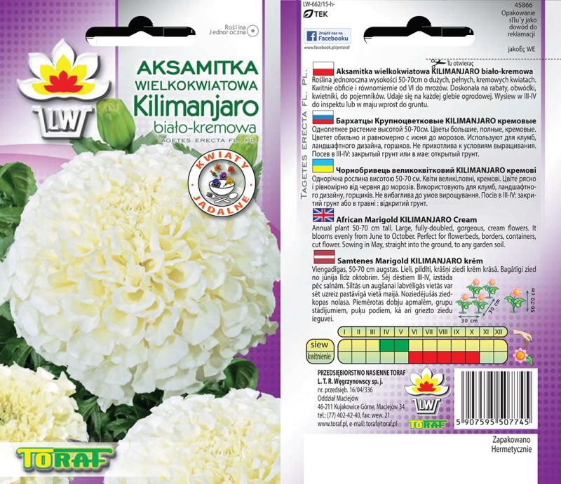 Roślina jednoroczna wysokości 50-70cm o pięknych, pełnych, dużych kwiatach barwy kremowej. Kwitnie obficie i równomiernie od VI do mrozów. Doskonała na rabaty, obwódki, kwietniki, do pojemników i na kwiat cięty.