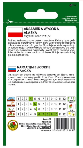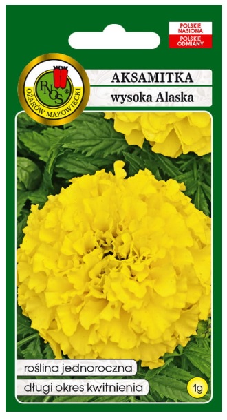 Aksamitka pełna wysoka Alaska cytrynowa to roślina jednoroczna, doskonała na rabaty, obwódki, kwietniki, balkony. Odmiana wczesna, obficie i równomiernie kwitnąca o pełnych, dwubarwnych dużych kwiatach, średnicy 8-12 cm. Wysiew nasion w kwietniu pod osłonami lub w maju wprost do gruntu. Na miejsce stałe wysadzać w końcu maja.