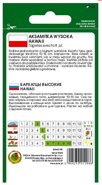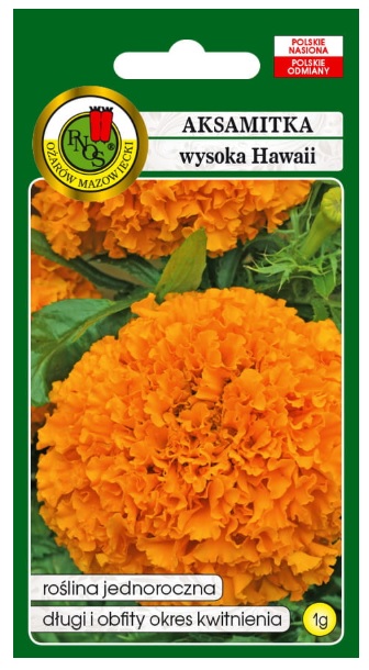 Aksamitka pełna wysoka Hawaii pomarańczowa to roślina jednoroczna, doskonała na rabaty, obwódki, kwietniki, balkony. Odmiana wczesna, obficie i równomiernie kwitnąca o pełnych, dwubarwnych dużych kwiatach, średnicy 10-15 cm. Wysokość rośliny to 80-90 cm.