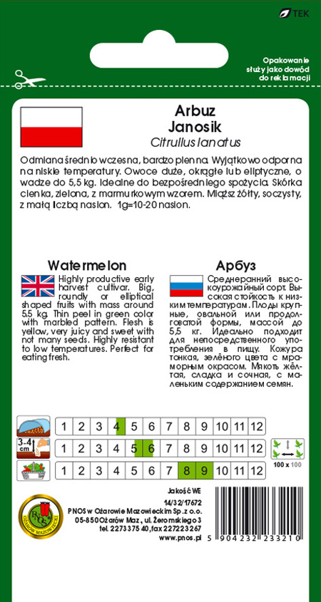 Arbuz Janosik zwany także kawonem to odmiana średnio wczesna (okres wegetacji 130-150 dni), dobrze dostosowana do naszych warunków klimatycznych. Janosika można z powodzeniem uprawiać na polu lub w tunelach foliowych (nie jest to konieczne).