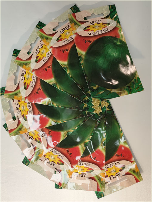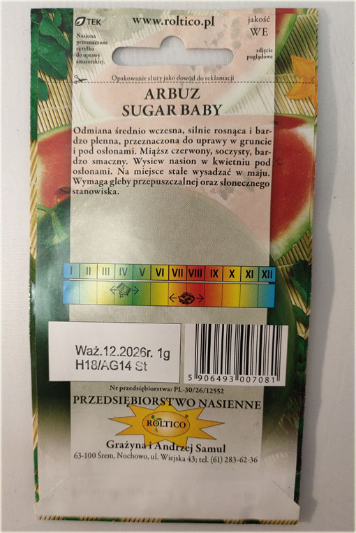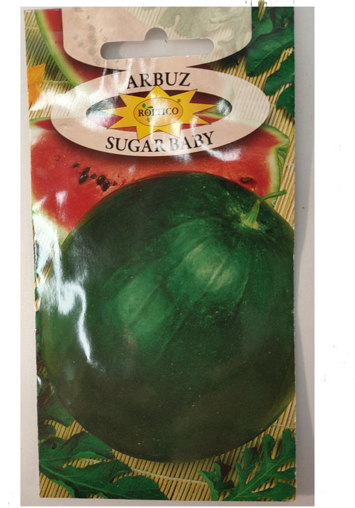Arbuz Sugar Baby czerwonyto odmiana średnio wczesna, silnie rosnąca i bardzo plenna, przeznaczona do uprawy w gruncie i pod osłonami. Miąższ czerwony, soczysty, bardzo smaczny. Wysiew nasion w kwietniu pod osłonami. Na miejsce stałe wysadzać w maju. Wymaga gleby przepuszczalnej oraz słonecznego stanowiska. Arbuzy należą do tej samej rodziny co dynia i ogórek, ale w ich przypadku zapylenie krzyżowe nie jest skuteczne. Zawiera dużo witaminy C, karotenoidów, kwasu foliowego i lipokenu. Spożywanie arbuza nawadnia organizm, gdyż miąższ owoców składa się przede wszystkim z wody. Najlepszy do spożycia bezpośredniego, ale również jako dodatek do sałatek, lodów czy deserów.