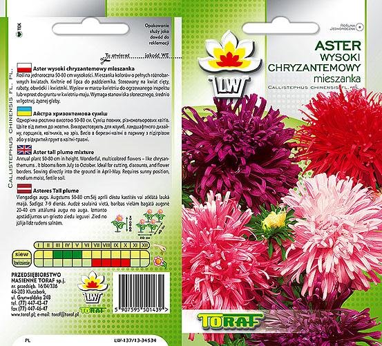 Roślina jednoroczna 50-80cm wysokości. Mieszanka kolorów o pełnych różnobarwnych kwiatach. Kwitnie od lipca do października.