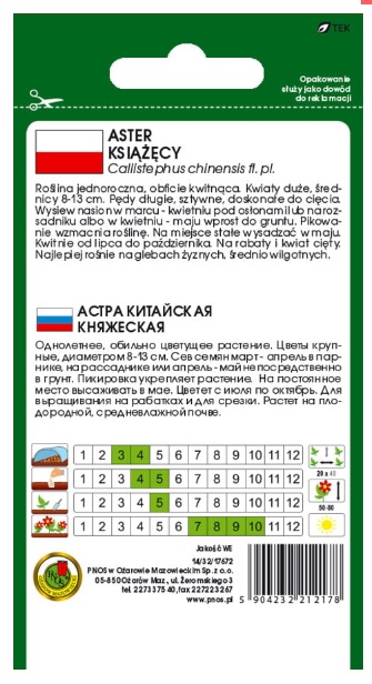 Aster książęcy biały jest rośliną jednoroczną, obficie kwitnącą. Kwiaty osiągają średnicę 8-13cm. Roślinę charakteryzuje wzniesiony typ pokroju – łodyga jest prosta, sztywna, słabo rozgałęziona i silnie ulistniona, u jej szczytu osadzone są gęste kwiatostany. Jest wabikiem na pszczoły i kolorowe motyle. Jest prosty w uprawie. Roślina dorasta średnio do 50-80cm wysokości. Kwitnie od lipca do końca października. Tworzy koszyczkowe kwiatostany – zewnętrzne kwiaty są języczkowate, wewnętrzne rurkowe. Kwiaty języczkowate mogą przybierać różną barwę, od białej, przez różne odcienie różu i czerwieni, po fioletową. Rurkowe są przeważnie żółte. Preferuje stanowiska słoneczne i ciepłe, z przepuszczalną, żyzną, stale wilgotną, lecz niezbyt mokrą i próchniczną glebą. Polecany na rabaty oraz na kwiat cięty – dość długo utrzymuje świeżość w wazonie, stanowi także atrakcyjny element kompozycji kwiatowych.