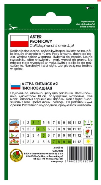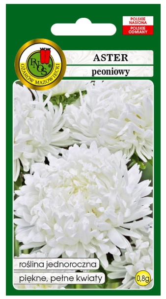 Aster peoniowy biały charakteryzuje się pokrojem zwartym lub pół rozpierzchłym. Ma sztywne proste pędy zakończone pełnymi prawie kulistymi kwiatostanami. Typowe dla tej grupy astrów są kwiaty języczkowe szerokie zagięte do środka kwiatostanu o średnicy 8-9cm. Roślina osiąga wysokość od 60 do 70cm. Wysiew nasion w marcu i kwietniu do ogrzewanego inspektu lub wprost do gruntu w maju. Na miejsce stałe wysadzać w maju. Kwitnie obficie od lipca do października. Doskonale nadają się do cięcia. Kwiaty długo zachowują świeżość w wazonie. Są również ozdobą jesiennych rabat.