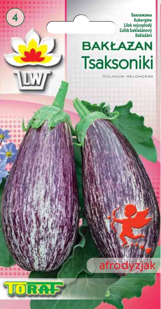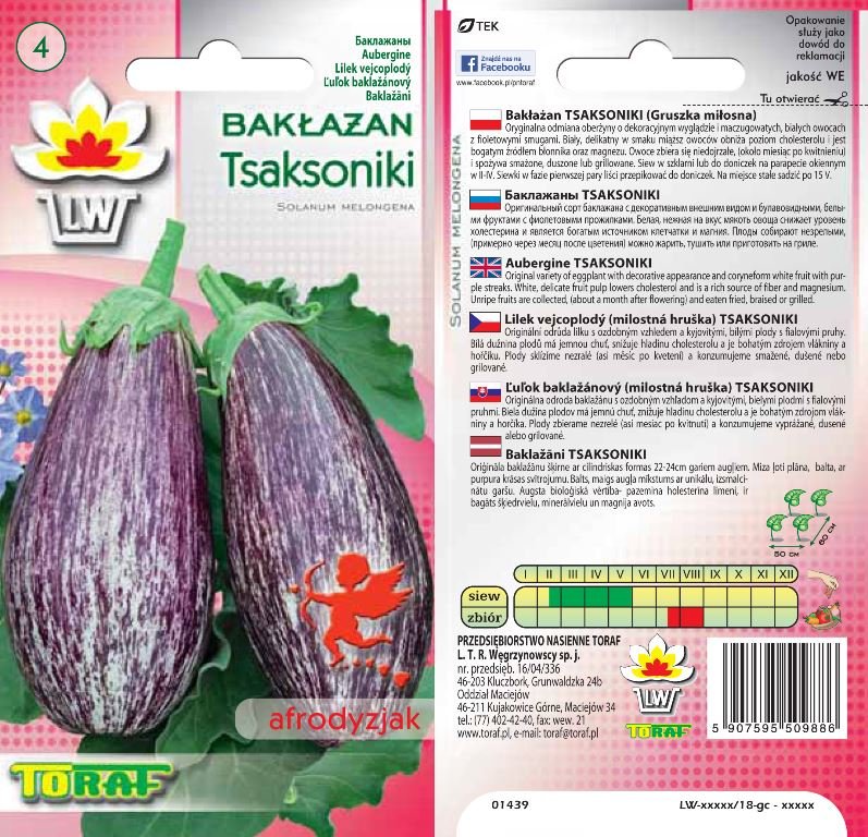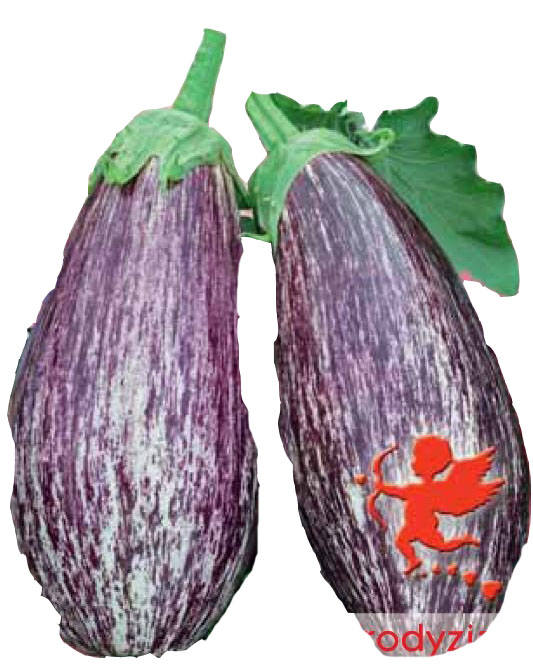 Oryginalna odmiana oberżyny o dekoracyjnym wyglądzie i maczugowatych, białych owocach z fioletowymi smugami.