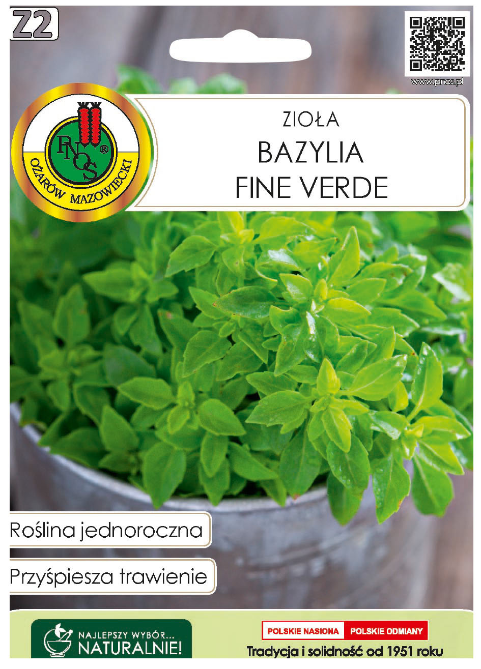 Bazylia Fine Verde to roślina jednoroczna, uprawiana z rozsady lub z siewu wprost do gruntu nawet na domowym parapecie. Roślina osiąga wysokość 30-50cm. Surowcem przyprawowym jest jej ziele w stanie świeżym lub suszonym. Bazylia jest bogata w przeciwutleniacze i witaminy, m.in. witaminę A, K, C, magnez, żelazo, potas i wapń. Doskonale nadaje się do uprawy w ogródku jak i na kuchennym parapecie. Stanowi doskonałą przyprawę do sałatek, pizz, zup, sosów, drobiu, ryb i pomidorów. Roślina wymaga ciepłego, osłoniętego i dobrze nasłonecznionego stanowiska oraz żyznej, przepuszczalnej, próchniczej i stale wilgotnej gleby. Nietolerancyjna na suszę, zalewanie, zachwaszczenie i przeciągi. Nie jest też odporna na niską temperaturę i nawet najmniejszy przymrozek jest dla niej zabójczy. Z tego względu wysiew lub sadzenie bazylii w ogrodzie są możliwe dopiero w drugiej połowie maja. Uprawiając bazylię, należy też pamiętać, aby młodym roślinom uszczykiwać wierzchołki, dzięki czemu będą mogły lepiej się rozkrzewiać. Ma wzniesiony pokrój, jej proste, nagie, czworokątne łodygi rozgałęziają się u podstawy. Liście bazylii są jajowate, lekko błyszczące, o długości do 5 cm. Na spodniej stronie liści znajdują się gruczołki zawierające olejki eteryczne.