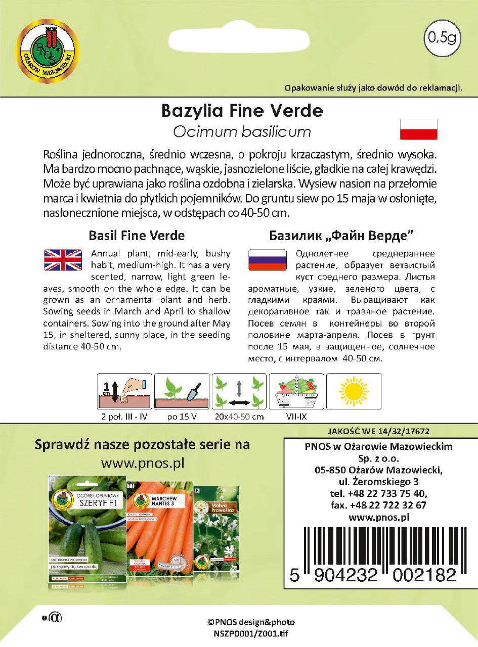 Bazylia Fine Verde to roślina jednoroczna, uprawiana z rozsady lub z siewu wprost do gruntu nawet na domowym parapecie. Roślina osiąga wysokość 30-50cm. Surowcem przyprawowym jest jej ziele w stanie świeżym lub suszonym. Bazylia jest bogata w przeciwutleniacze i witaminy, m.in. witaminę A, K, C, magnez, żelazo, potas i wapń. Doskonale nadaje się do uprawy w ogródku jak i na kuchennym parapecie. Stanowi doskonałą przyprawę do sałatek, pizz, zup, sosów, drobiu, ryb i pomidorów. Roślina wymaga ciepłego, osłoniętego i dobrze nasłonecznionego stanowiska oraz żyznej, przepuszczalnej, próchniczej i stale wilgotnej gleby. Nietolerancyjna na suszę, zalewanie, zachwaszczenie i przeciągi. Nie jest też odporna na niską temperaturę i nawet najmniejszy przymrozek jest dla niej zabójczy. Z tego względu wysiew lub sadzenie bazylii w ogrodzie są możliwe dopiero w drugiej połowie maja. Uprawiając bazylię, należy też pamiętać, aby młodym roślinom uszczykiwać wierzchołki, dzięki czemu będą mogły lepiej się rozkrzewiać. Ma wzniesiony pokrój, jej proste, nagie, czworokątne łodygi rozgałęziają się u podstawy. Liście bazylii są jajowate, lekko błyszczące, o długości do 5 cm. Na spodniej stronie liści znajdują się gruczołki zawierające olejki eteryczne.