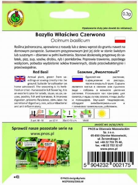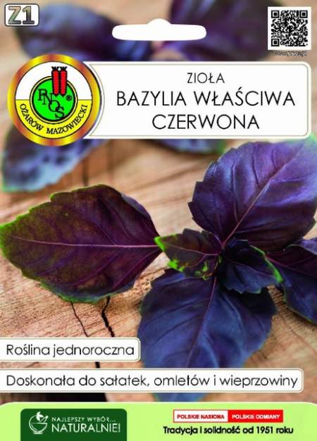 Bazylia właściwa czerwona to roślina jednoroczna, uprawiana z rozsady lub z siewu wprost do gruntu nawet na domowym parapecie. Surowcem przyprawowym jest jej ziele w stanie świeżym lub suszonym - zbierane w pełni kwitnienia. Bazylia właściwa czerwona stanowi doskonałą przyprawę do sałatek, pizzy, zup, sosów, drobiu, ryb i pomidorów. Poprawia trawienie, zapobiega wzdęciom, pobudza wydzielanie soków trawiennych, działa przeciwbakteryjnie i przeciwzapalnie.