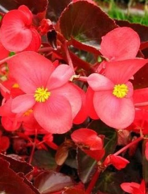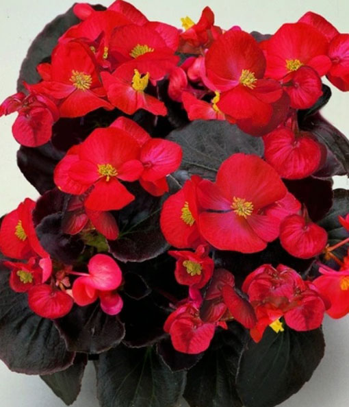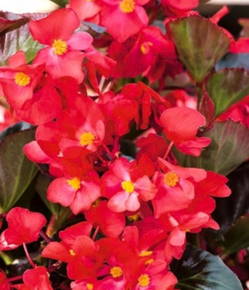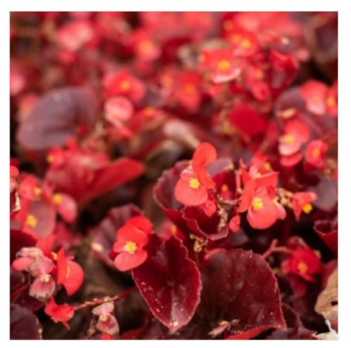 Begonia czerwona, czerwonolistna Begonia semperflorens to jednoroczna roślina o dekoracyjnych właściwościach. Rośnie szybko i tworzy gęsty i zwarty pokrój czerwono zabarwionych liści, które są pięknym tłem dla czerwonych kwiatów z żółtym oczkiem. Begonie z roku na rok zyskują na popularności. Przede wszystkim ze względu na bardzo długie i obfite kwitnienie od lipca do pierwszych przymrozków, a także za uniwersalność. Begonie mogą zdobić niskie rabaty, kwietniki, klomby, a także nasadzenia w miastach. Są bardzo odporne i wytrzymałe, dlatego wiele osób sadzi je również na cmentarzach, gdzie doskonale radzą sobie nawet rzadko podlewane i pielęgnowane.