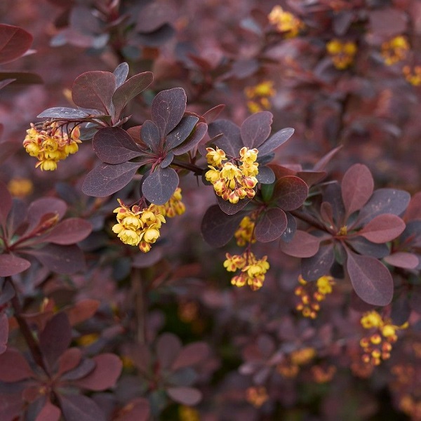 Berberys Thunberga atropurpurea rośnie dziko w Japonii. Dorasta do wysokości 1,5 m. Pędy są czerwonawe, z pojedynczymi cierniami. Są to przekształcone liście. Drewno ma bardzo ładny, żółty kolor. Liście są łopatkowe, drobne, bez ząbków na brzegu (w odróżnieniu od berberysu zwyczajnego).