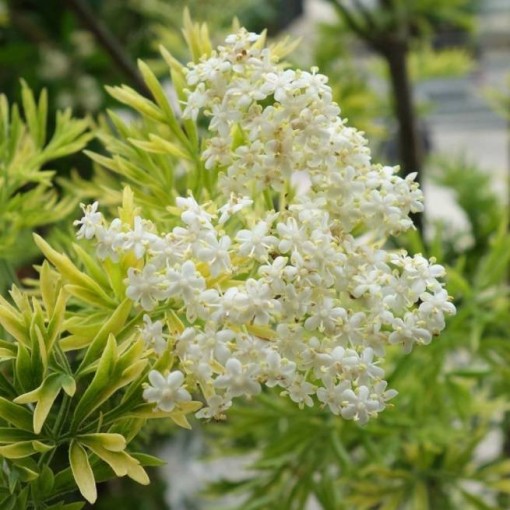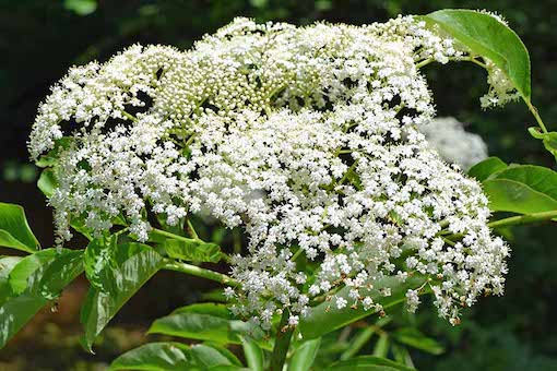 Jest to bardzo duży krzew, dorasta nawet do do 6 m wysokości i ma tyleż samo metrów szerokości. Ozdoba rośliny: Białe lub kremowe, bardzo drobne kwiaty zebrane w okazałe, płaskie baldachy. Kwiaty wydzielają charakterystyczny, silny zapach, który może wydawać się słodko mdły. Po przekwitnięciu powstają czarnofioletowe owoce zebrane w zwisające owocostany. Liście ciemnozielone, eliptyczne.