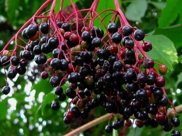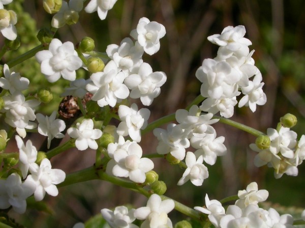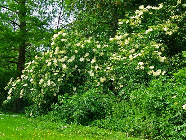 Jest to bardzo duży krzew, dorasta nawet do do 6 m wysokości i ma tyleż samo metrów szerokości. Ozdoba rośliny: Białe lub kremowe, bardzo drobne kwiaty zebrane w okazałe, płaskie baldachy. Kwiaty wydzielają charakterystyczny, silny zapach, który może wydawać się słodko mdły. Po przekwitnięciu powstają czarnofioletowe owoce zebrane w zwisające owocostany. Liście ciemnozielone, eliptyczne.