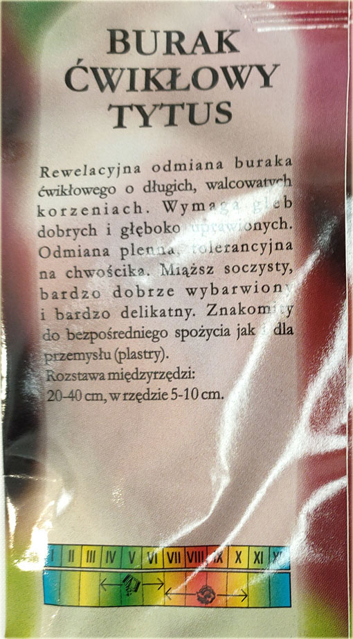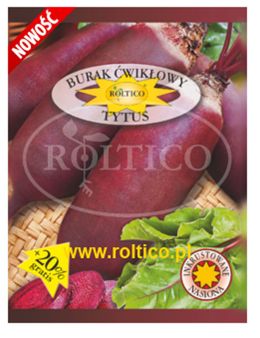 Burak ćwikłowy Tytus to rewelacyjna odmiana buraka ćwikłowego o długich, walcowatych korzeniach. Wymaga gleb dobrych i głęboko uprawionych. Odmiana plenna, tolerancyjna na chwościka. Miąższ soczysty, bardzo dobrze wybarwiony i bardzo delikatny. Znakomity do bezpośredniego spożycia