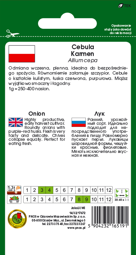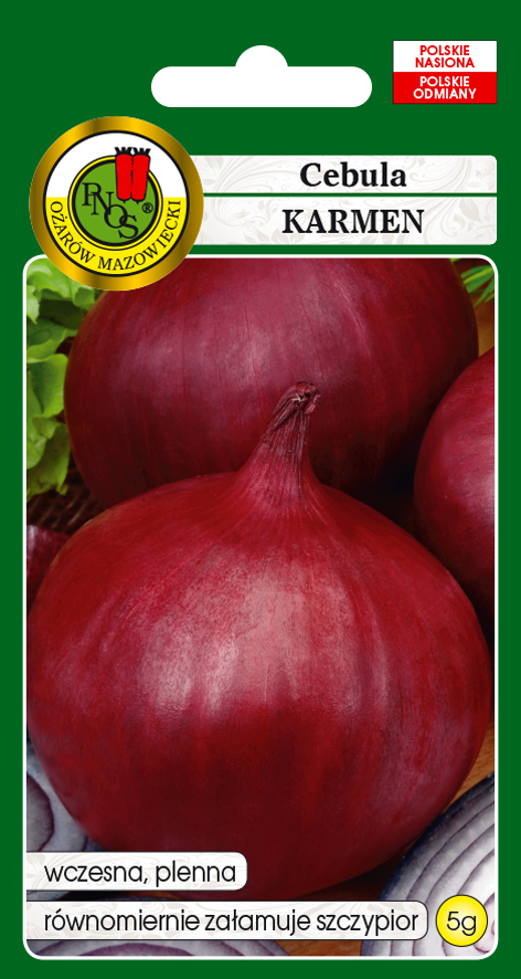 Cebula Karmen to dmiana o pięknej karminowo-czerwonej barwie łuski. Tworzy duże kulisto-romboidalne cebule, o twardym, soczystym, fioletowo-białym, łagodnym w smaku miąższu. Równocześnie załamuje szczypior i nie ma tendencji do tworzenia cebul bączastych. Bardzo dobrze przechowuje się do późnej wiosny.