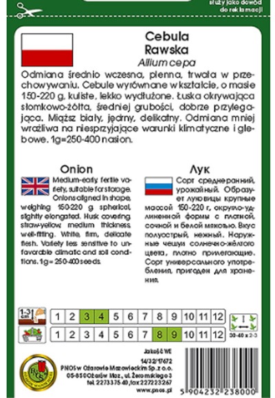Cebula Rawska zalecana jest szczególnie do uprawy w rejonach o krótszym okresie wegetacji. Jest mniej wrażliwa na mniej sprzyjające warunki klimatyczne oraz glebowe. Można z niej uzyskać znacznie większy plon niż z innych odmian. Cebule wyrównane w kształcie, o masie 150-220 g, kuliste, ze skłonnością do lekkiego wydłużania się. Łuska zewnętrzna słomkowożółta, średniej grubości, dobrze przylegającą. Miąższ biały, jędrny, delikatny. Zalecana do uprawy na dymkę.