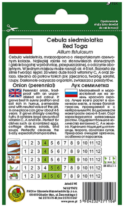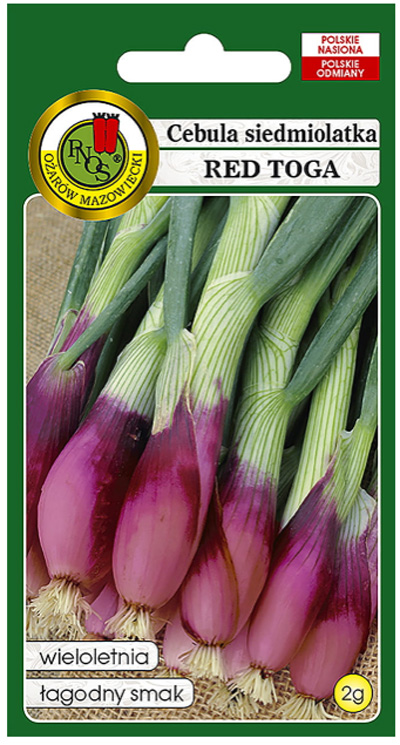 Cebula siedmiolatka Red Toga wieloletnia, mrozoodporna o czerwonym kolorze. Najlepiej rośnie na stanowiskach słonecznych i glebie bogatej w próchnicę, przepuszczalnej, o odczynie obojętnym. W jednym miejscu może rosnąć ok 4-5 lat. Rozrasta się silnie tworząc kępki.