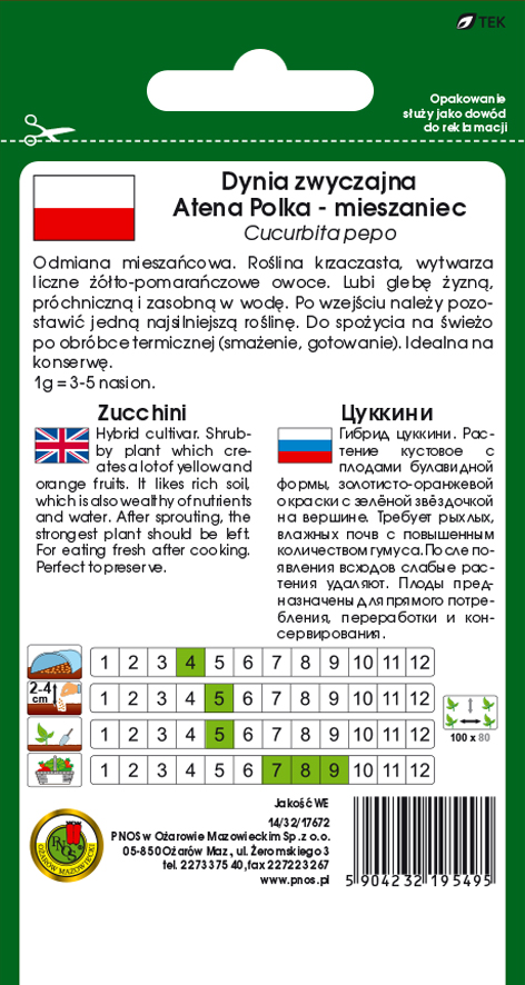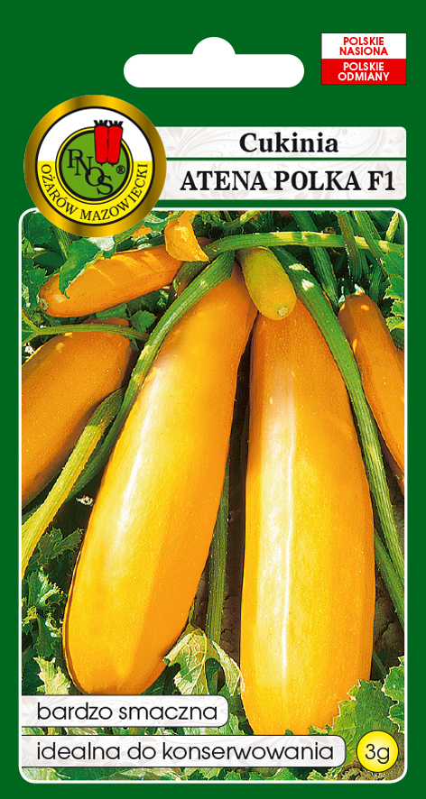 Cukinia Atena Polka to pierwsza polska odmiana mieszańcowa cukinii. Krzaczaste rośliny wytwarzają bardzo liczne owoce o barwie pomarańczowej.Wysiewać w kwietniu do doniczek lub w drugiej połowie maja wprost do gruntu po 2-3 ziarna w jedno miejsce. Wymaga gleby żyznej, próchnicznej i zasobnej w wodę.