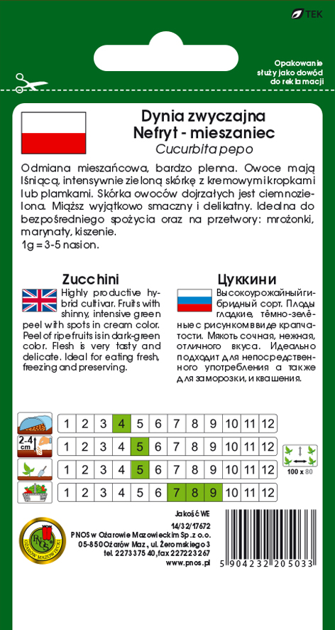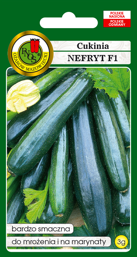 Cukinia Nefryt to odmiana wytwarzająca bardzo dużą ilość owoców. Owoce mają lśniącą, intensywnie zieloną skórkę z kremowymi kropkami lub plamkami. Skórka owoców dojrzałych jest ciemnozielona. Plon owoców młodych (12-15cm) wynosi około 40 t/ha, dłuższych (ok. 35cm) 100t/ha. Polecana szczególnie dla przetwórstwa: mrożonki, marynaty, kiszenie jak i na świeże spożycie.