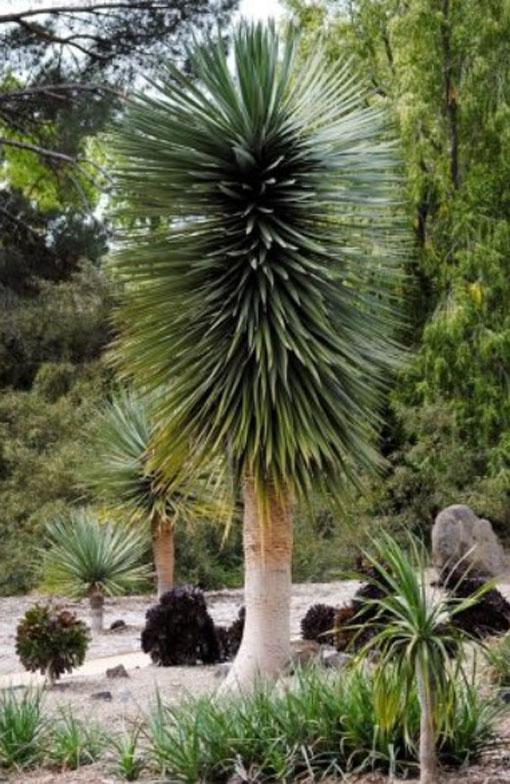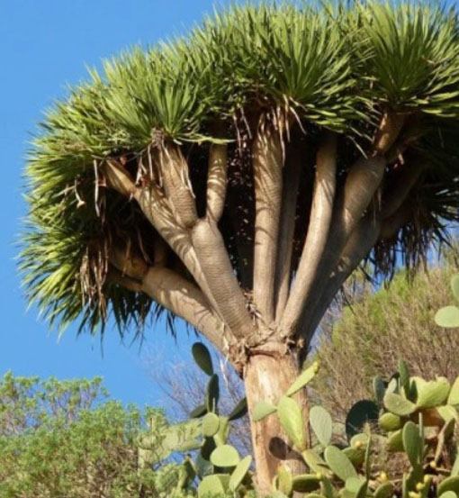 Dracena smocza Dracena draco to jedna z najbardziej znanych i piękniejszych roślin doniczkowych. Przyjmuje formę drzewka, początkowo niedużego, mocno rozgałęzionego. Roślina jest bardzo długowieczna, niektóre znane okazy w środowisku naturalnym mają ponad 1000 lat. Liście bardzo liczne, podłużno-lancetowate, ostro zakończone. Tworzą atrakcyjny pióropusz. Kolor ciemnozielony, czasami z delikatnym, stalowym odcieniem. Większe rośliny potrafią w mieszkaniu zakwitnąć, wytwarzając wiechowate kwiatostany długości około 30 cm. Zawierają one zielonkawo – białawe kwiaty, które po przekwitnięciu zamieniają się w pomarańczowo – czerwone owoce.