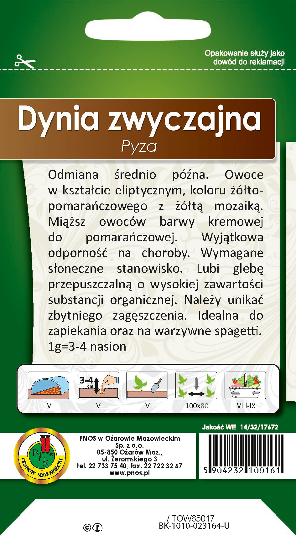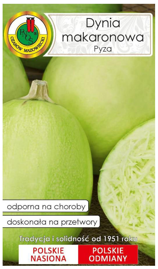 Dynia makaronowa Pyza to odmiana średnio późna. Dynia, której miąższ po ugotowaniu rozpada się na włókna jak makaron spaghetti. Znakomite warzywo dietetyczne. Rośliny o pokroju krzaczastym z dużą ilością pędów bocznych. Owoce średniej wielkości, o kształcie eliptycznym, gładkie.