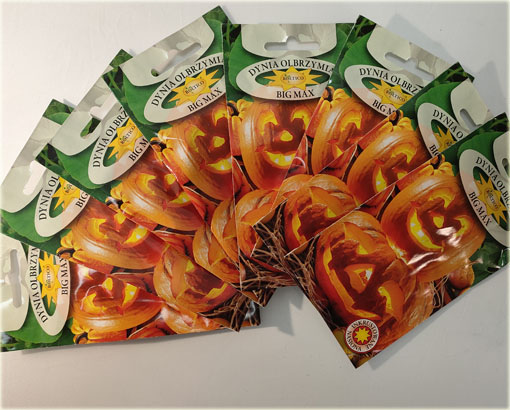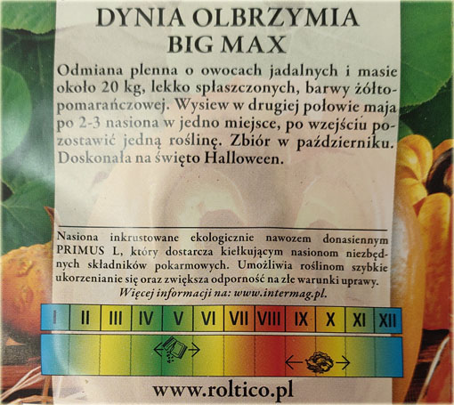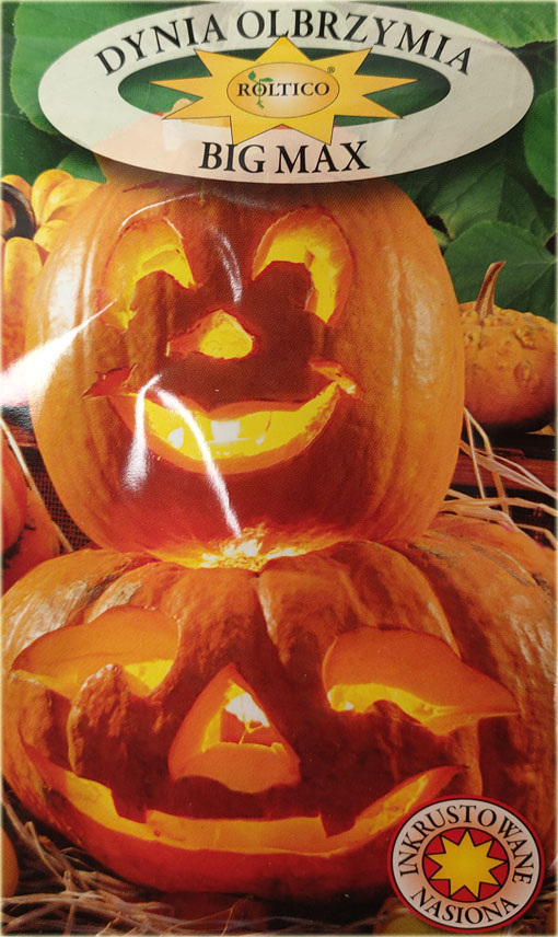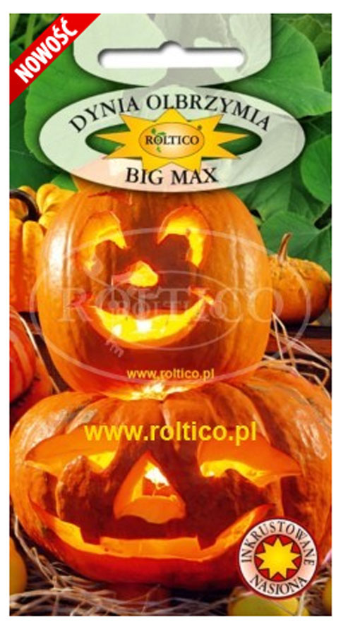 Dynia olbrzymia Big Max to odmiana plenna o owocach jadalnych i masie ok. 20 kg, lekko spłaszczonych, barwy żółtopomarańczowej. Wysiew w drugiej połowie maja po 2-3 nasiona w jedno miejsce, po wzejściu pozostawić jedną roślinę. Zbiór w październiku. Doskonała na święto Halloween. Dynia to wspaniały i wartościowy owoc, który nie jest trudny w uprawie. Obojętnie, czy w wersji jadalnej, czy też ozdobnej, każda dynia cieszy, kiedy podczas hodowli systematycznie nabiera koloru i różnych kształtów.