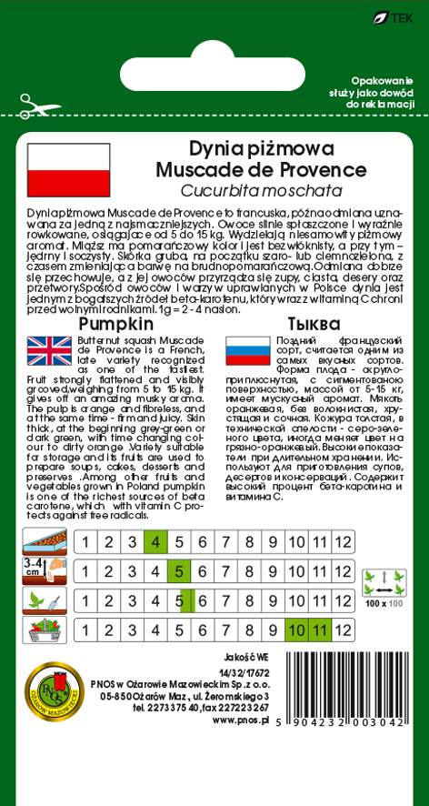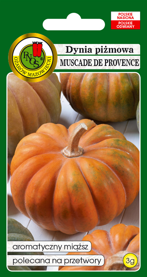 Dynia piżmowa Muscade de Provence to francuska, późna odmiana uznawana za jedną z najsmaczniejszych. Owoce silnie spłaszczone i wyraźnie rowkowane, osiągające od 5 do 15 kg. Wydzielają niesamowity piżmowy aromat. Miąższ ma pomarańczowy kolor i jest bezwłóknisty, a przy tym – jędrny i soczysty. Skórka gruba, na początku szaro- lub ciemnozielona, z czasem zmieniająca barwę na brudnopomarańczową. Odmiana dobrze się przechowuje, a z jej owoców przyrządza się zupy, ciasta, desery oraz przetwory. Spośród owoców i warzyw uprawianych w Polsce dynia jest jednym z bogatszych źródeł beta-karotenu, który wraz z witaminą C chroni przed wolnymi rodnikami.