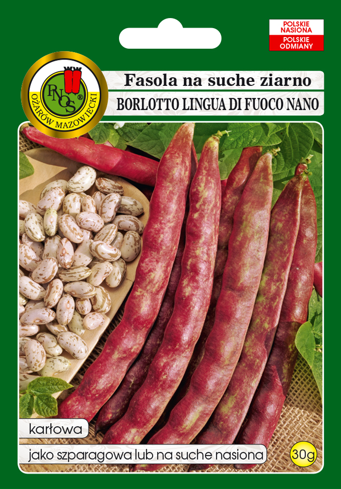 Fasola na suche nas Borlotto to odmiana wczesna To karłowa odmiana fasoli. Może być wykorzystywana zarówno jako szparagowa jak i do uprawy na suche nasiona. Charakteryzuje się szerokimi, bezwłóknistymi, soczystymi strąkami o nietypowej, żółtozielonej barwie z czerwonymi naciekami. 1g = 2 - 6 nasion.