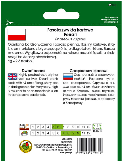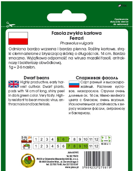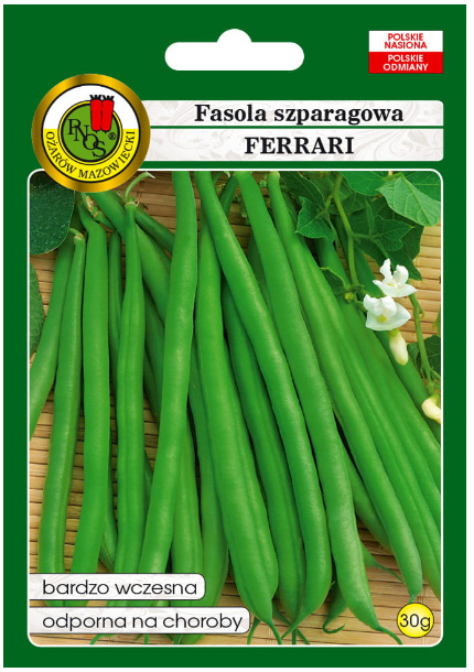 Fasola szparag zielona Ferrari to doskonała odmiana karłowa, zielona, średniopóźna. Smaczna, bez łyka. Odporna na wirusa zwykłej mozaiki fasoli, antraknozę i bakteriozę obwódkową fasoli. Długość strąka ok. 13 cm. Stanowisko: Dobrze plonuje na glebach żyznych, bogatych w próchnicę, ciepłych i przepuszczalnych. Dla przedłużenia okresu plonowania można siać sukcesywnie, co 10 - 14 dni do połowy lipca. Przeznaczona: Do bezpośredniego spożycia, konserwowania i mrożenia.