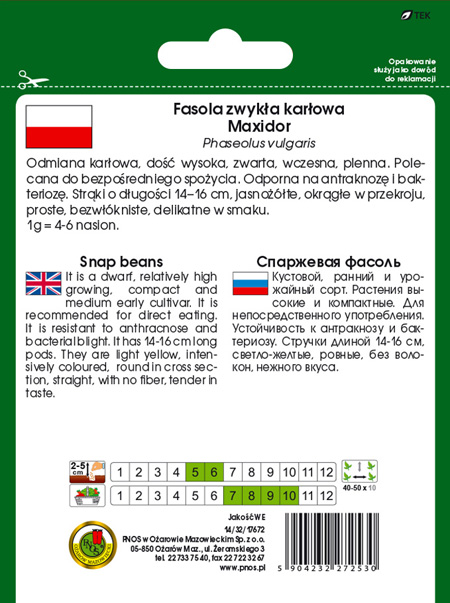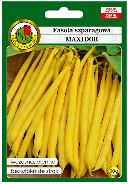 Fasola szparag żółta Maxidor to odmiana wczesna. Rośliny karłowe, dość wysokie, zwarte. Strąki długości 14-16 cm, jasnożołte, okrągłe na przekroju, proste, bezwłókniste, delikatne w smaku. Odmiana bardzo plenna, polecana do bezpośredniego spożycia.