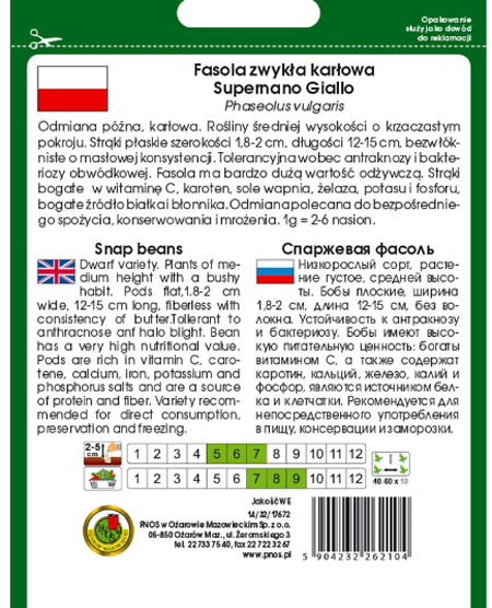 Fasola szparag żółta Supernano to odmiana średnio wczesna. Fasola o długich, płaskich, szerokich strąkach barwy żółtej. Strąki utrzymują piękną barwę i bez włóknistość do końca wegetacji. Odmiana bardzo smaczna, polecana do bezpośredniego spożycia, mrożenia i konserwowania. Rośliny silnie rozkrzewione o pokroju krzaczastym, odporne na antraknozę i bakteriozę obwódkową.