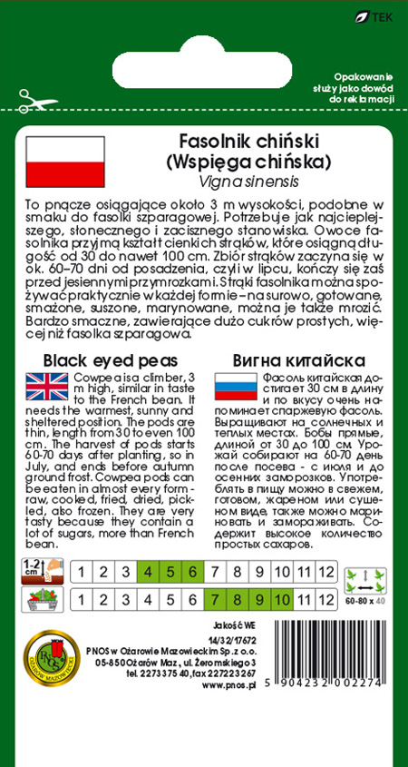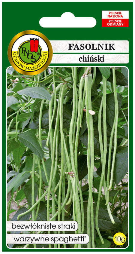 Fasolnik chiński - Wspięga chińska to pnącze osiągające około 3m wysokości, podobne w smaku do fasolki szparagowej. Wymaga ciepłego, słonecznego i zacisznego stanowiska. Owoce fasolnika mają kształt cienkich strąków, które osiągają długość od 30cm do 100cm. Pierwszy zbiór strąków około 60-70 dni od wysiewu. Zbiory należy wykonywać sukcesywnie. Owocuje do pierwszych przymrozków. Strąki fasolnika można spożywać w różnych formach - na surowo, gotowane, smażone, suszone, marynowane. Doskonałe do mrożenia. Fasolnik jest bardzo smaczny.