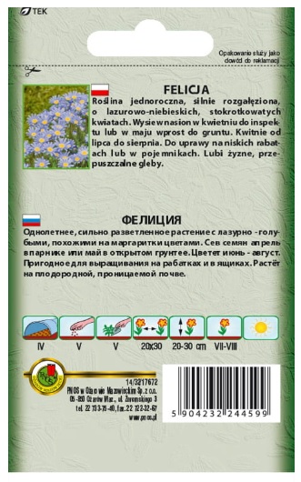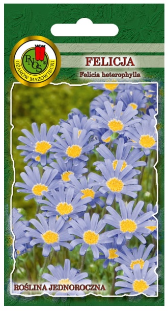 Felicja niebieska jest silnie rozkrzewioną byliną, u której wraz z czasem pojawia się zdrewnienie na dolnych częściach pędu. Pędy wzniesione i ulistnione. Zarówno pędy jak i niewielkich rozmiarów liście są szorstko owłosione. Często się zdarza, że pędy mają ciemno czerwonawe nabiegnięcie.