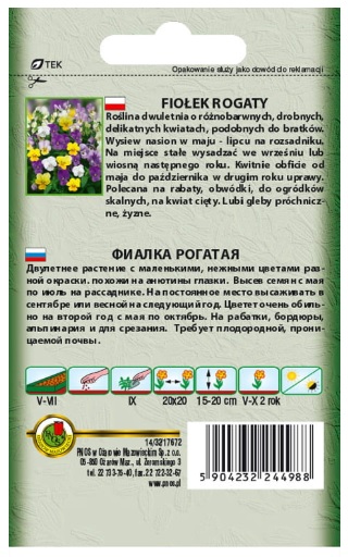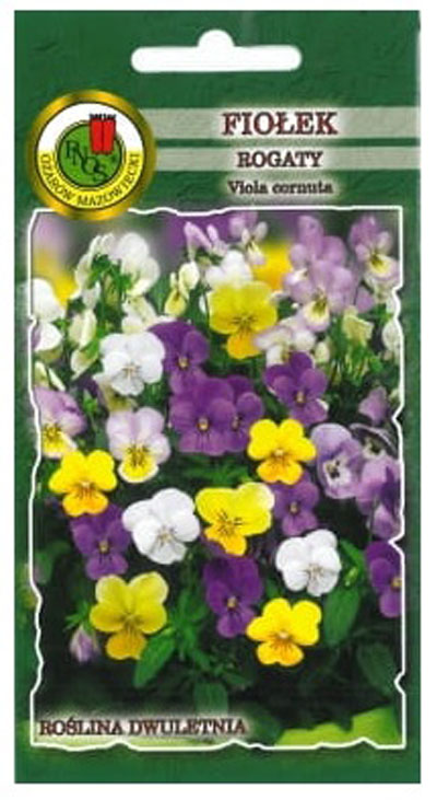 Fiołek rogaty mieszany to roślina dwuletnia o różnobarwnych, drobnych kwiatach, długo i obficie kwitnąca. Doskonale sprawdza się uprawiany w większej grupie, jako dekoracja rabat, balkonów, tarasów. Kwiaty są pięciopłatkowe z długą ostrogą, osadzone na długich szypułkach. Ich barwa jest zmienna. Poszczególne kwiaty są najczęściej 2-3 kolorowe. Kwitnie od maja do września.