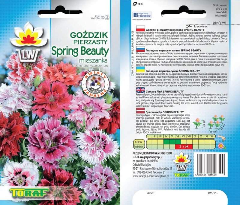 Roślina wieloletnia, wysokości 30cm, pięknie pachnąca o postrzępionych półpełnych kwiatach w różnych kolorach i trawiastych sinozielonych liściach. Roślina tworzy barwne kobierce bardzo obficie i długo kwitnące (VI-VIII). Rośnie nawet na stanowiskach suchych i nieco ciemnych.